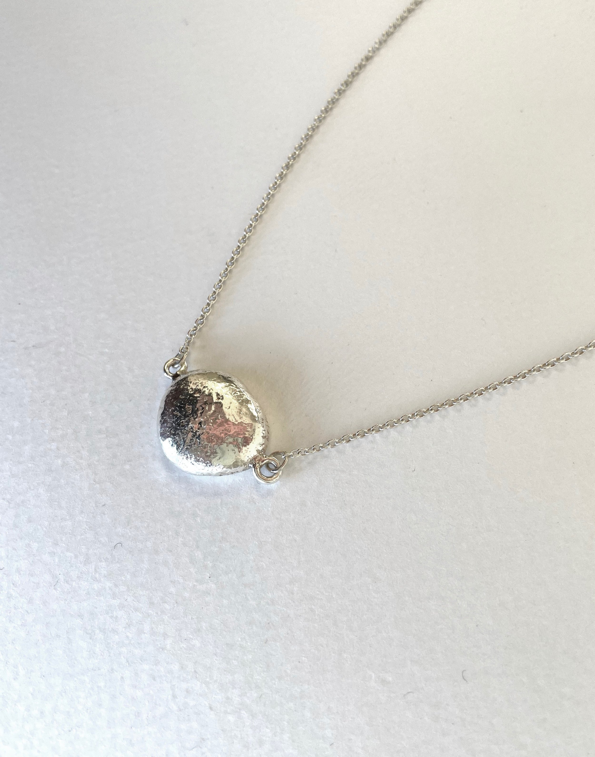 Our exquisite sterling silver blob necklace, showcases a free-form button-shaped silver blob is crafted from recycled materials. This unique centerpiece is a result of the processes involved in melting down old silver, giving it a new life and purpose. On a fine chain that is elegantly fixed on both sides of the central element, this necklace, this necklace seamlessly blends sustainability and sophistication, making it a perfect statement piece for those who appreciate both artistry and eco-conscious fashion.