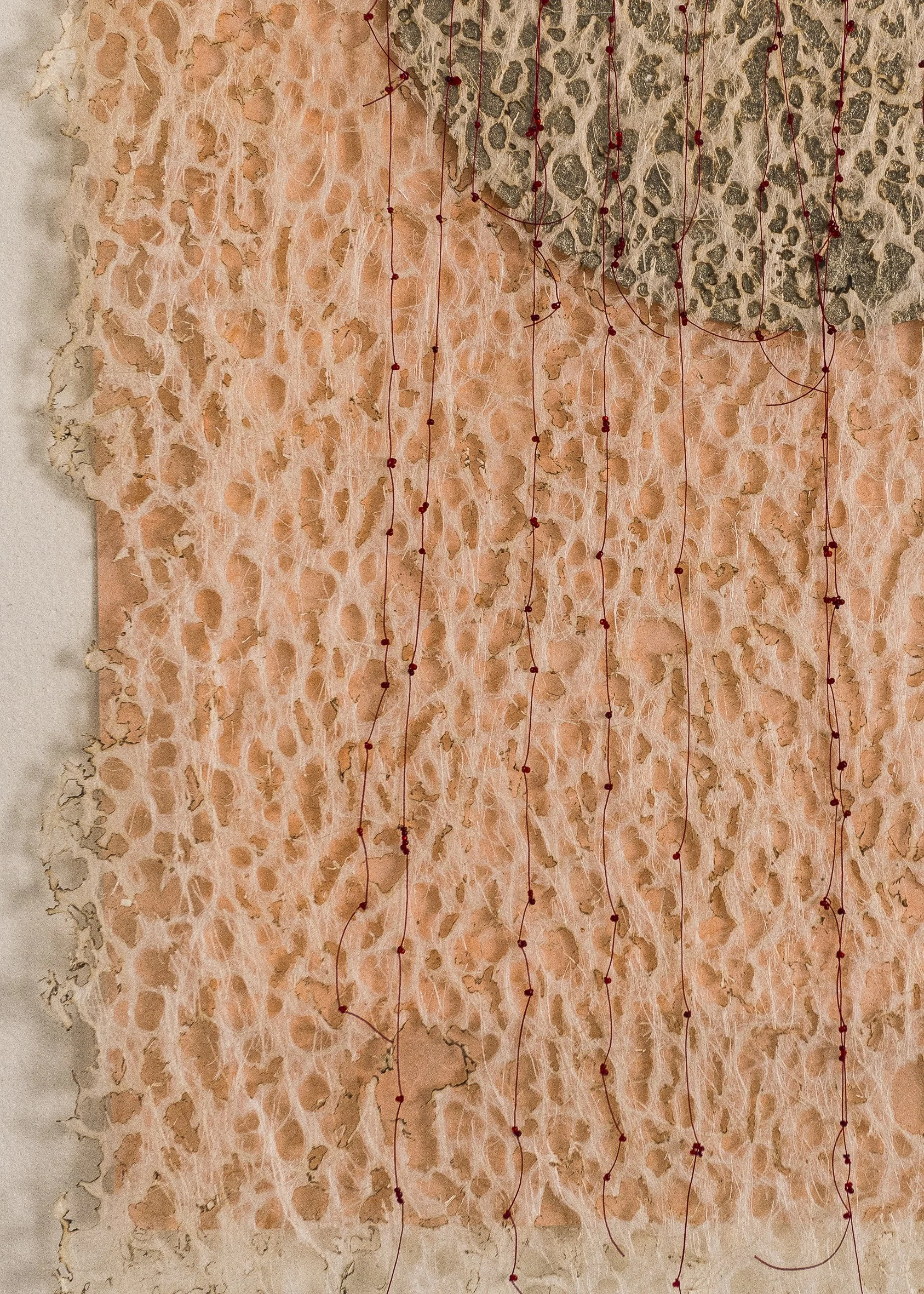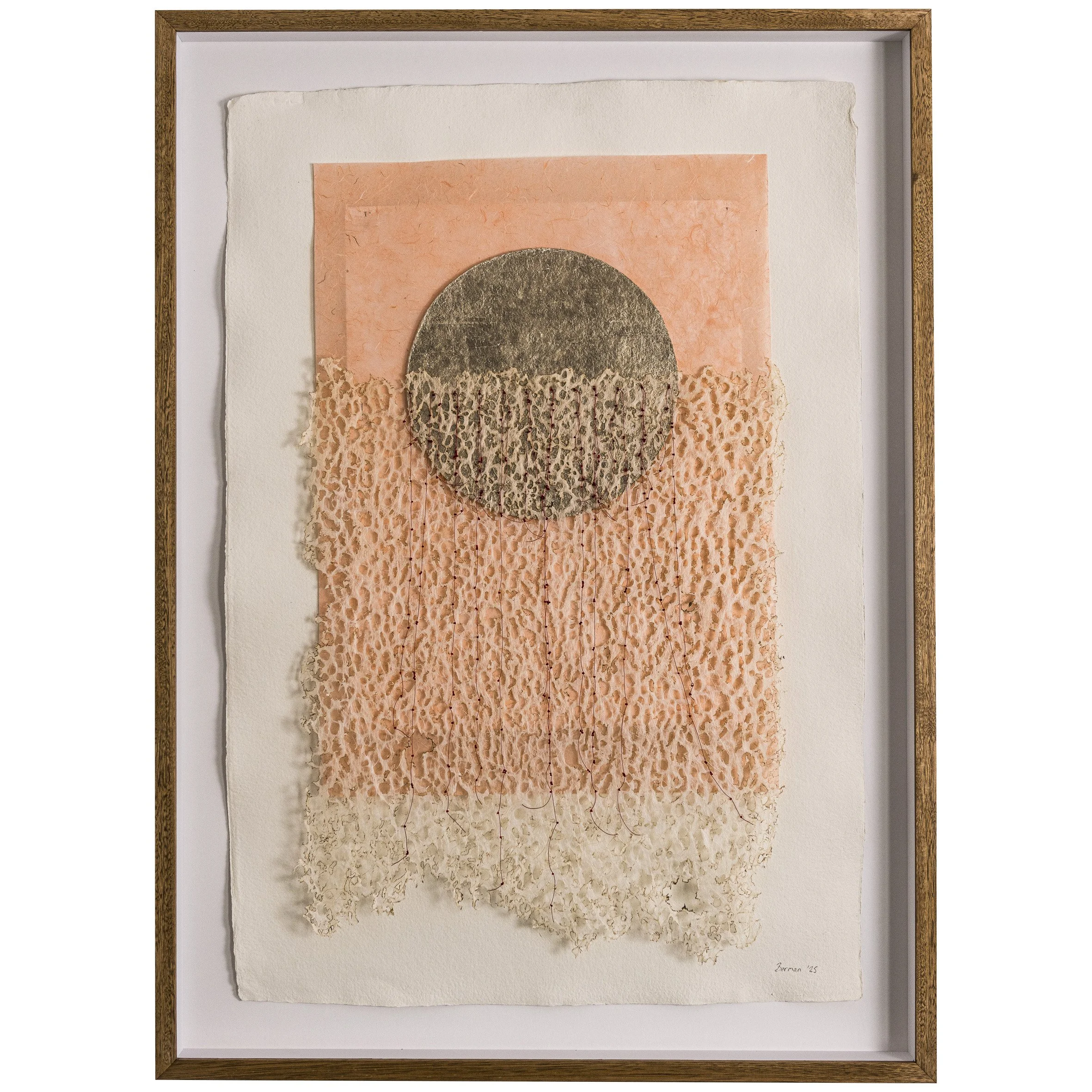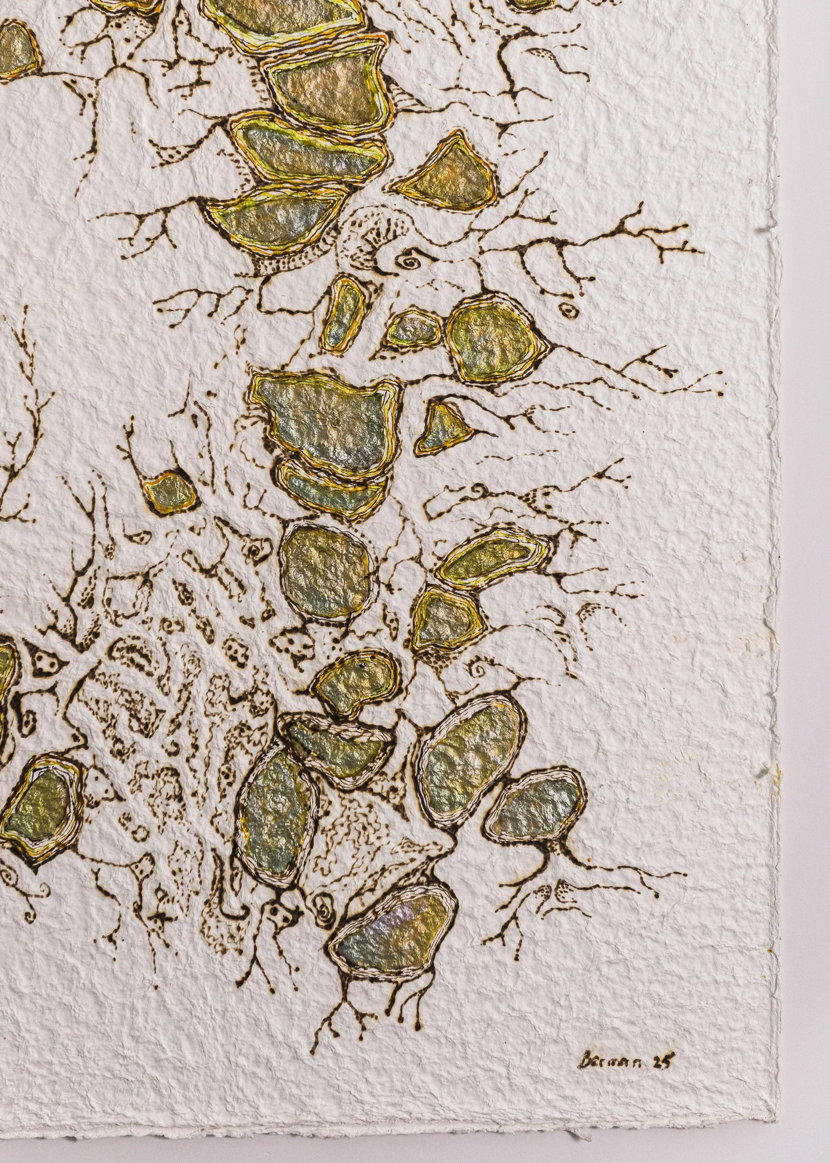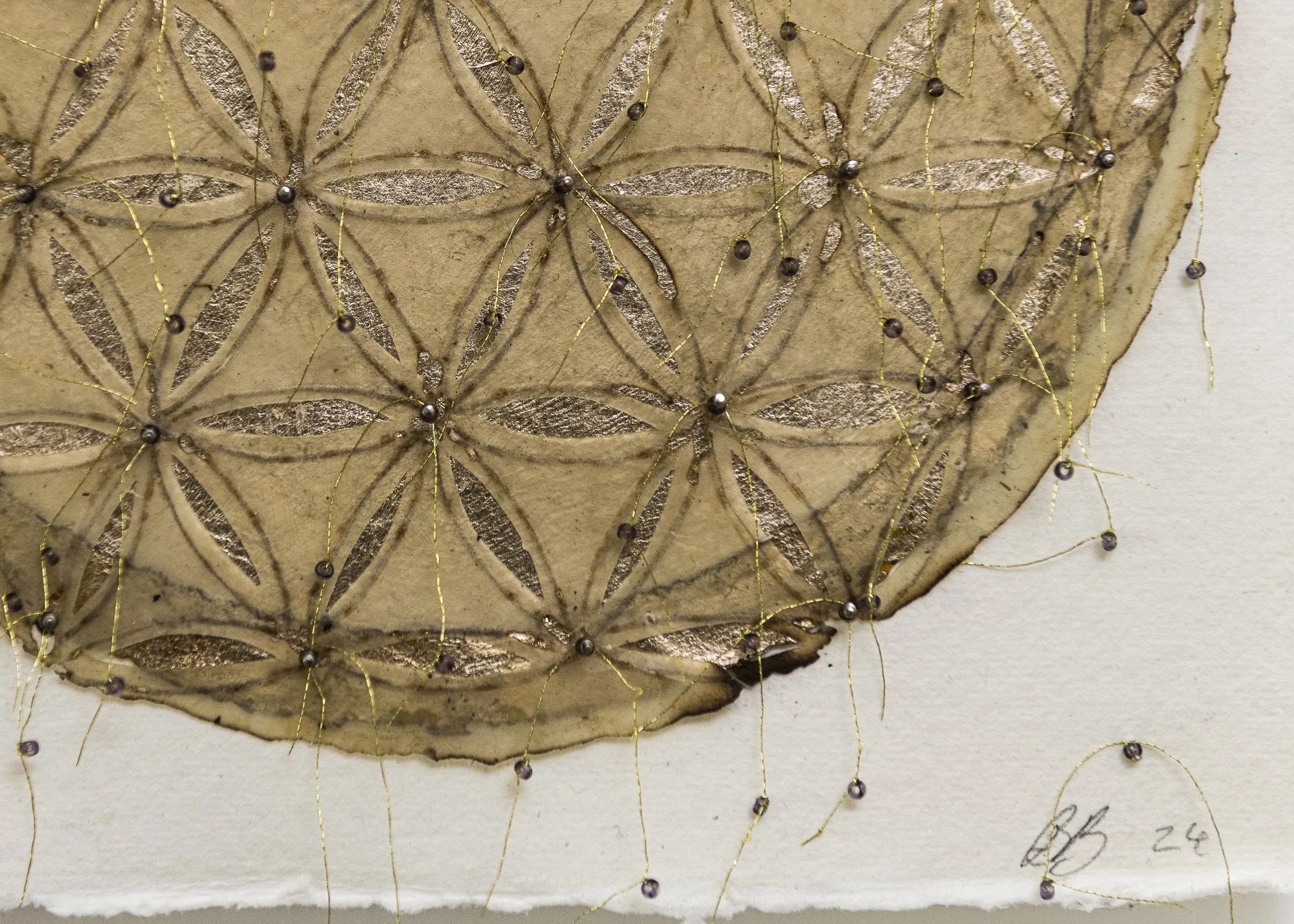 Another Secret of the Universe, 2024, Artisanal and handmade paper with burning tool, 24ct gold leaf, bees wax, quilting pins, 640 x 840mm. From the ‘Opening’ exhibition, Studio Bronwyn Berman 2024.
