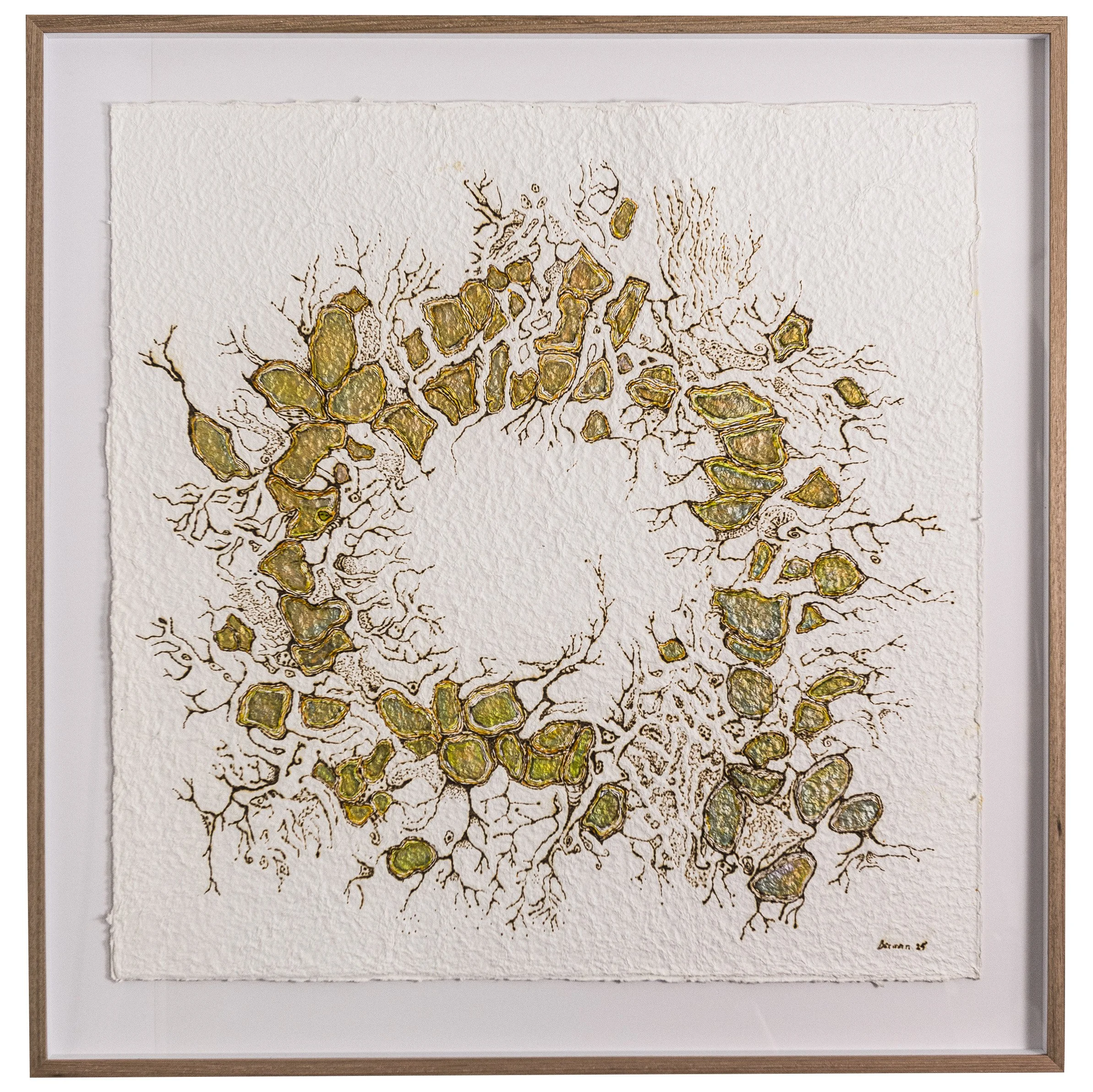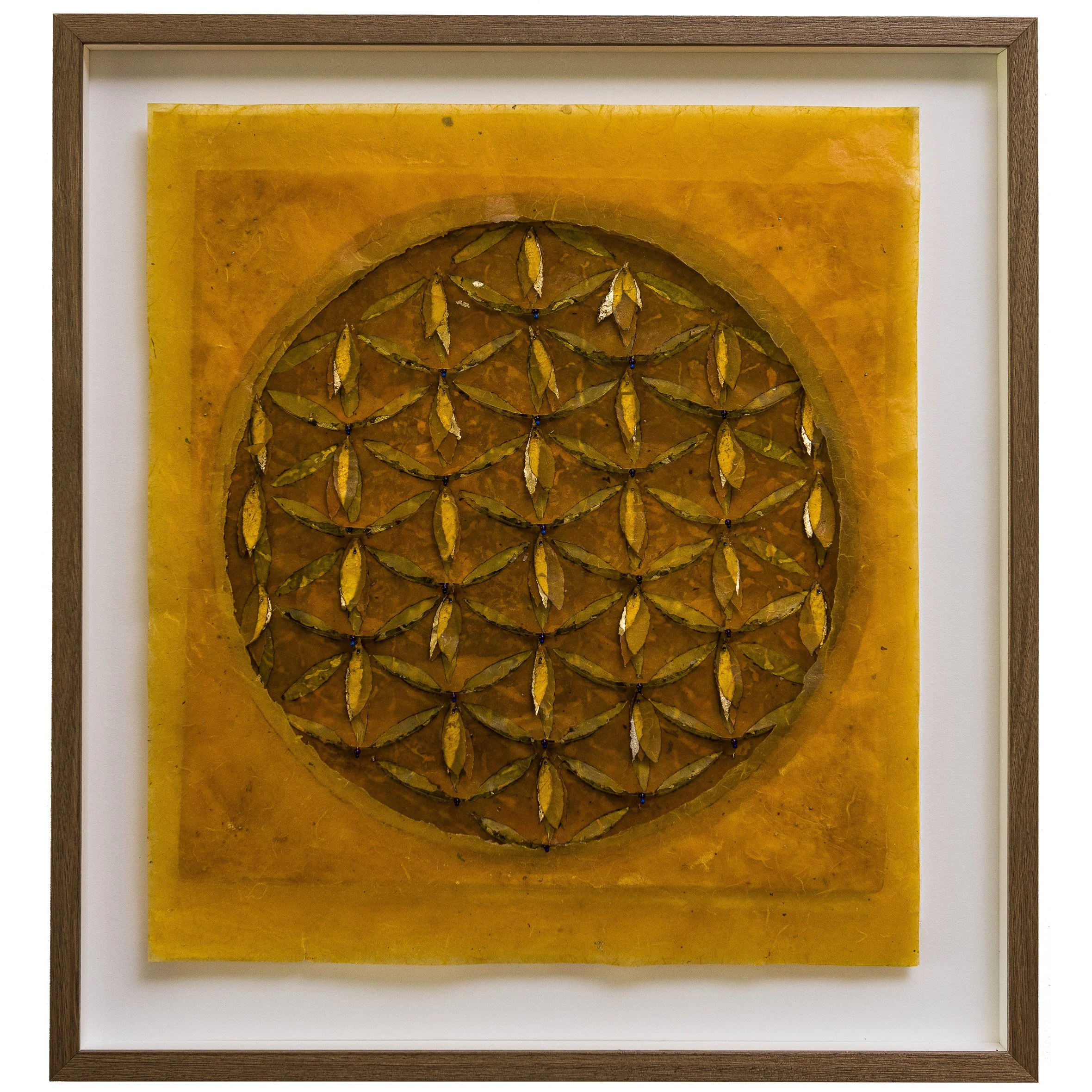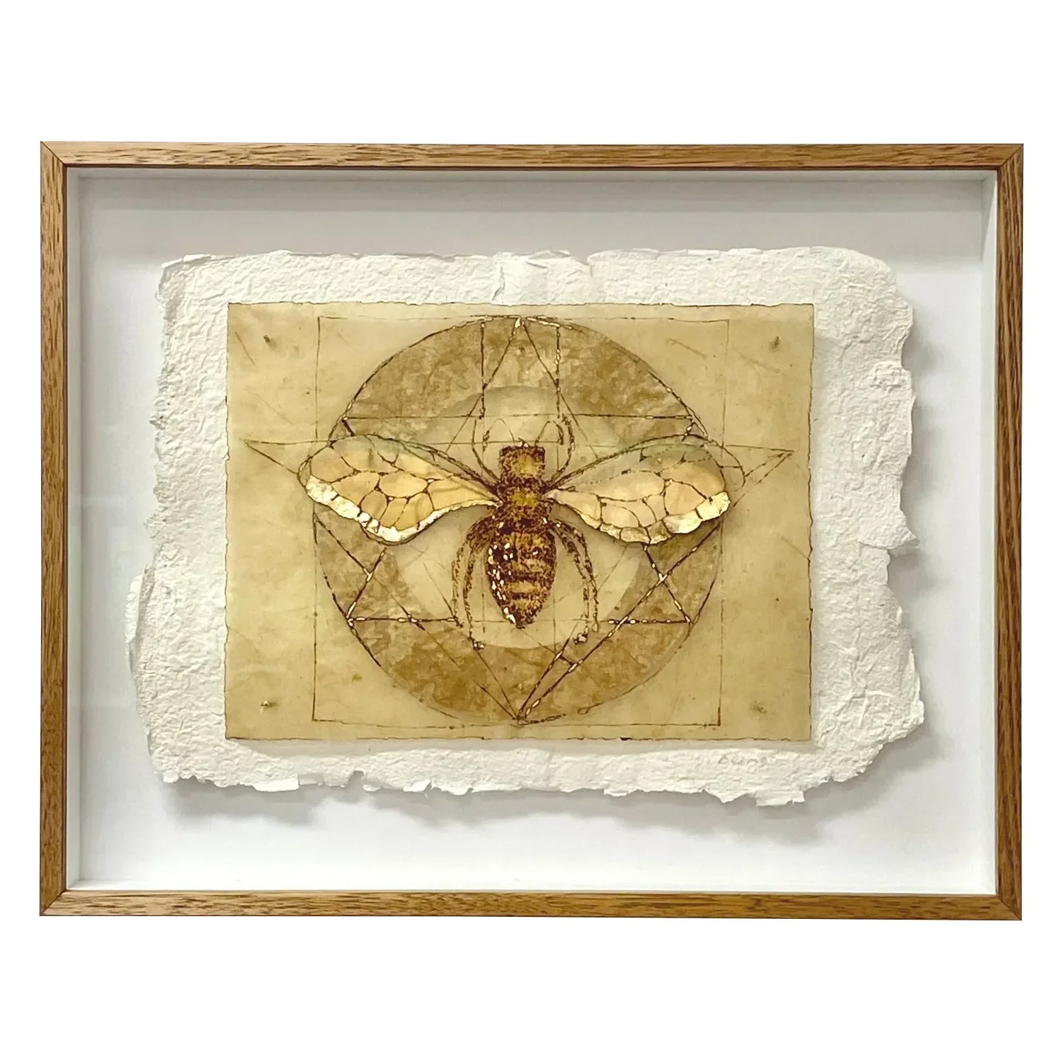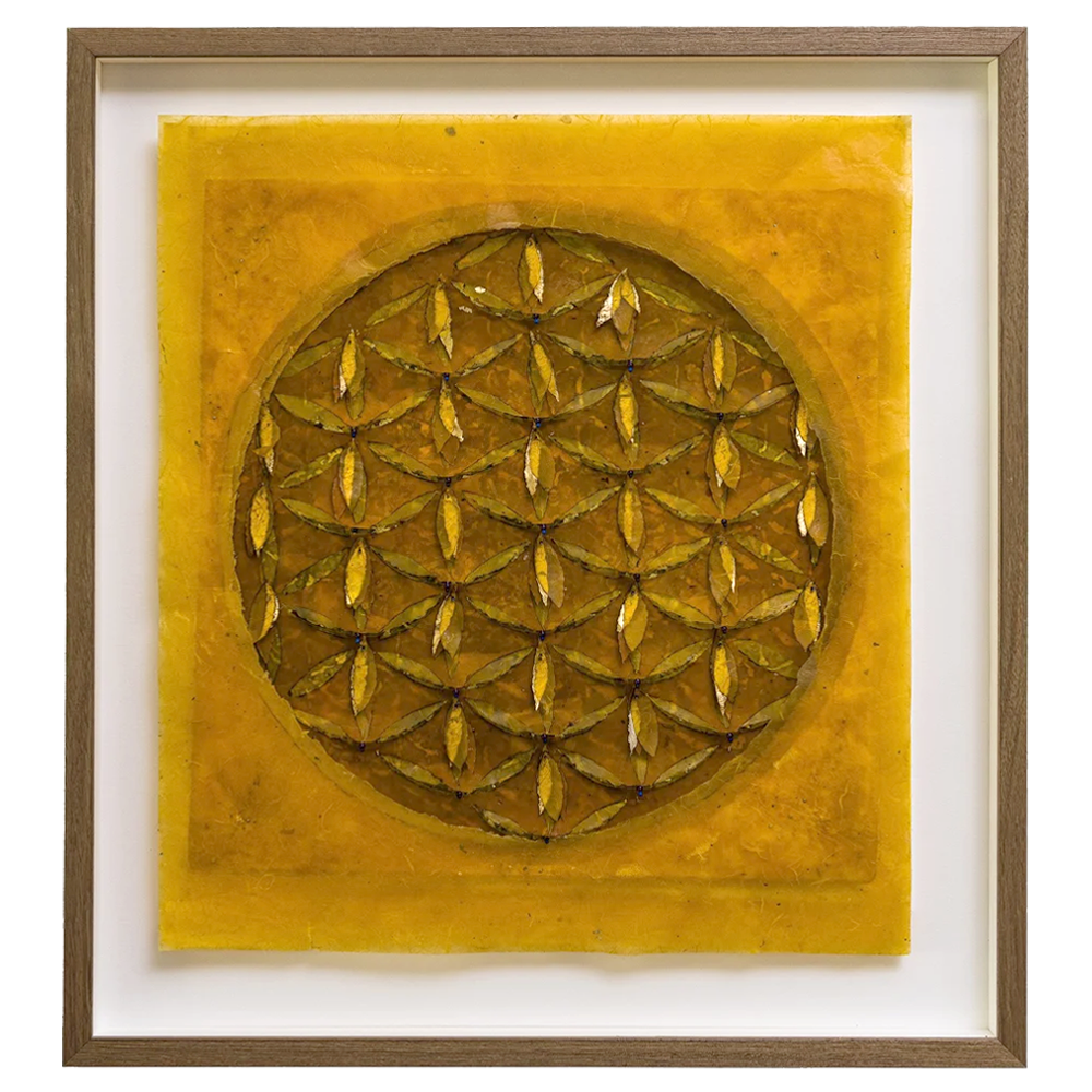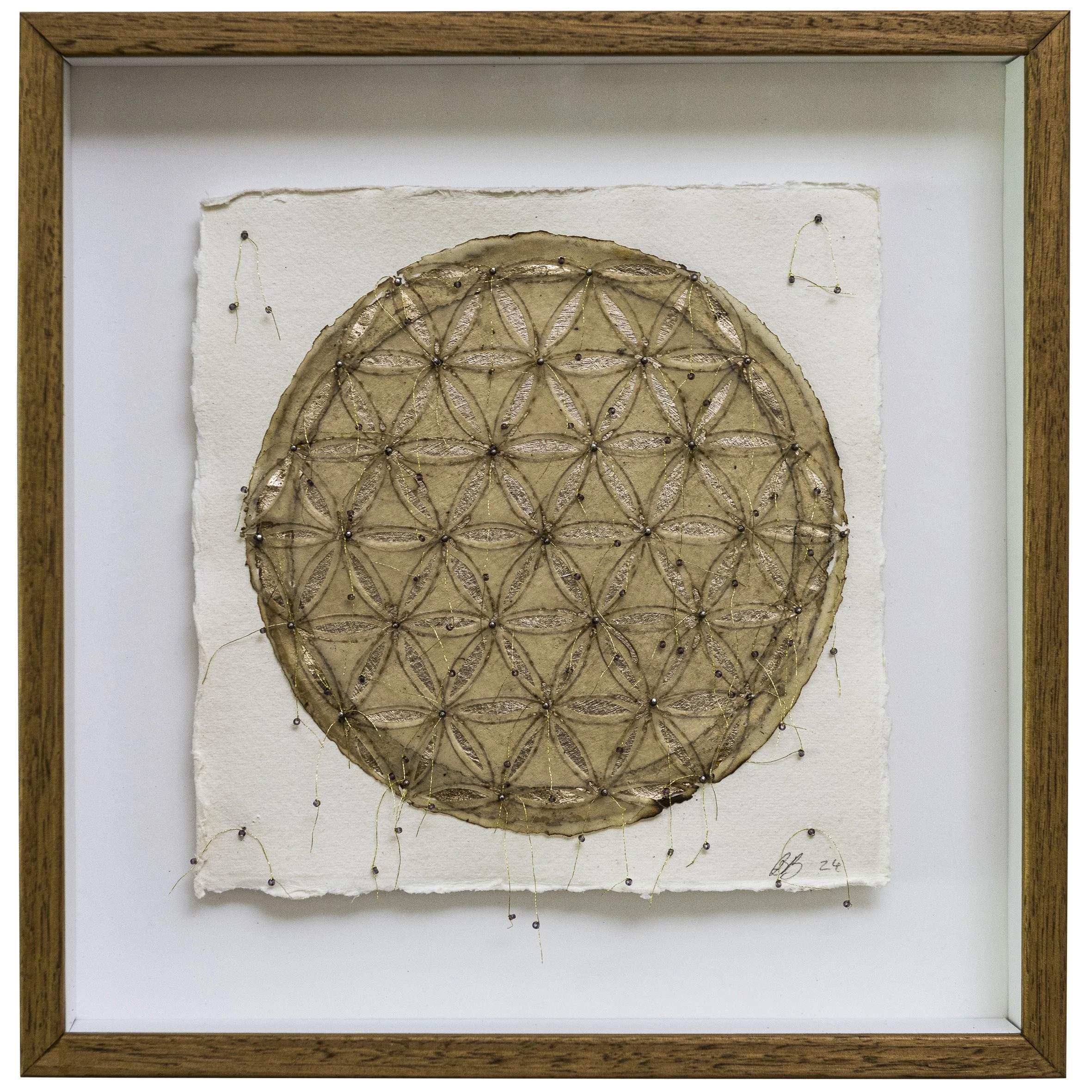 Another Secret of the Universe, 2024, Artisanal and handmade paper with burning tool, 24ct gold leaf, bees wax, quilting pins, 640 x 840mm. From the ‘Opening’ exhibition, Studio Bronwyn Berman 2024.