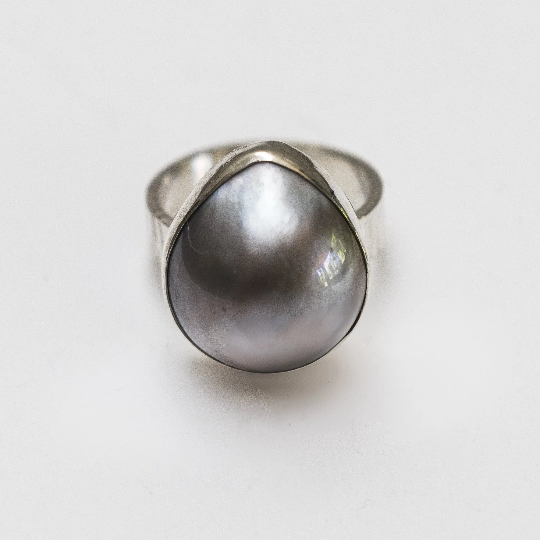 This stunning cocktail ring features a beautiful teardrop shaped grey Mabe pearl, bezel-set in premium sterling silver. The luminous pearl, with its soft, iridescent glow, is the centerpiece of this unique, artist-designed ring. Perfect for making a statement at any occasion, this one-of-a-kind ring is crafted with exceptional quality, offering both elegance and individuality. Elevate your jewelry collection with this exquisite piece, designed to stand out.