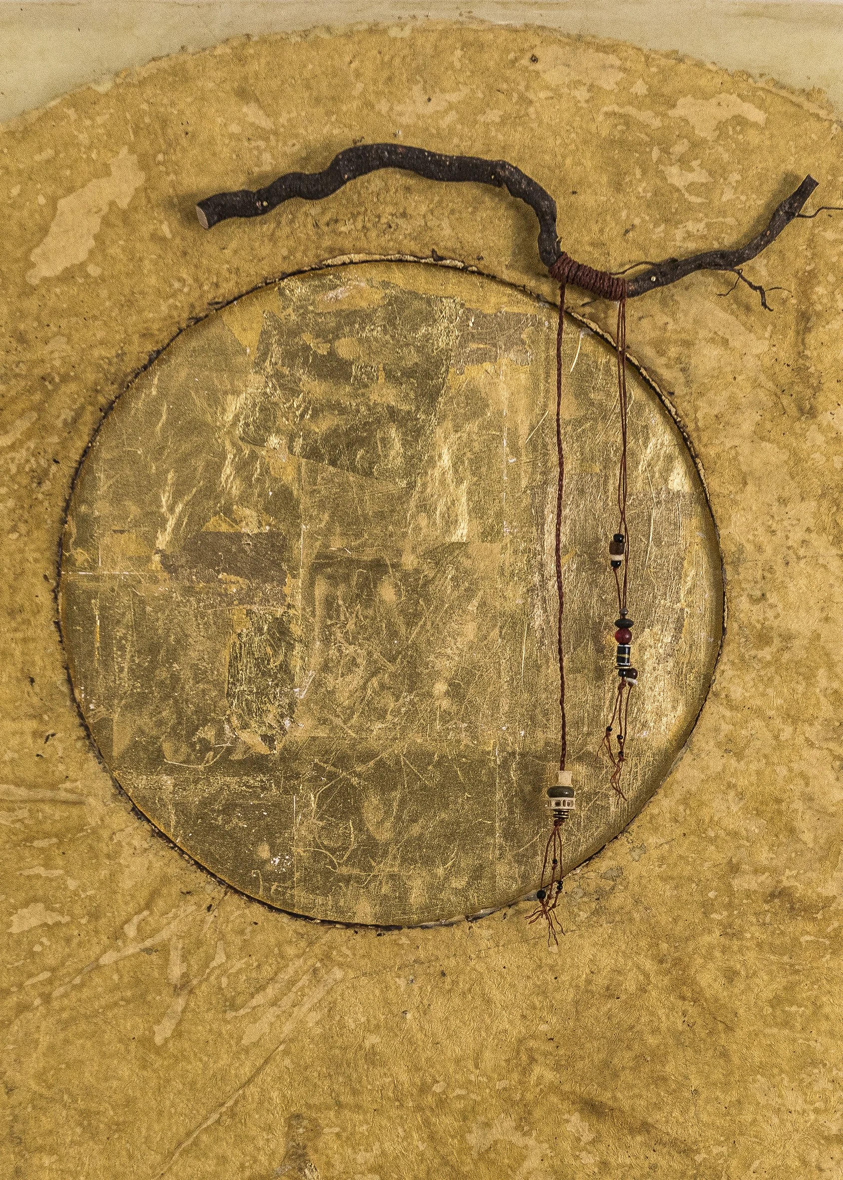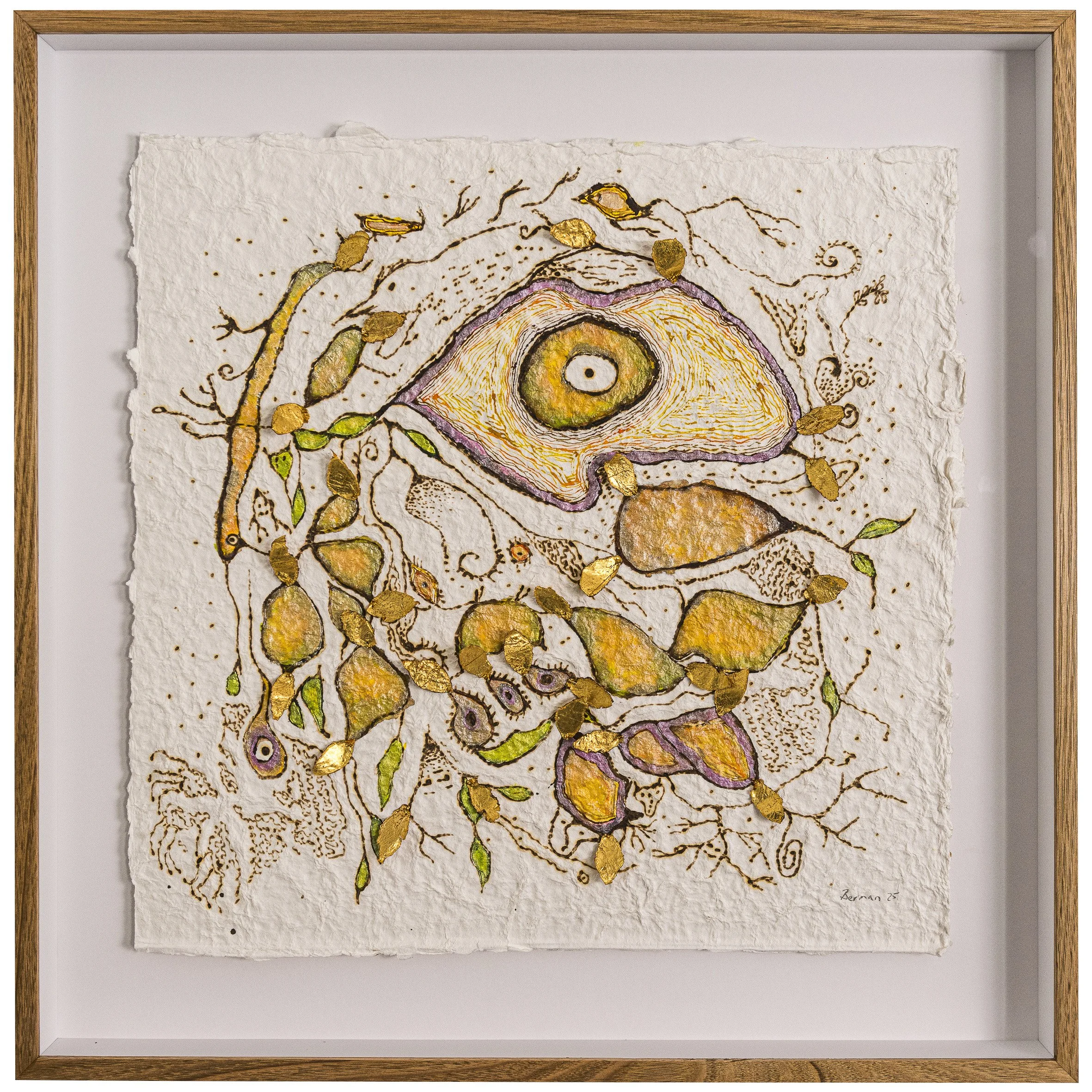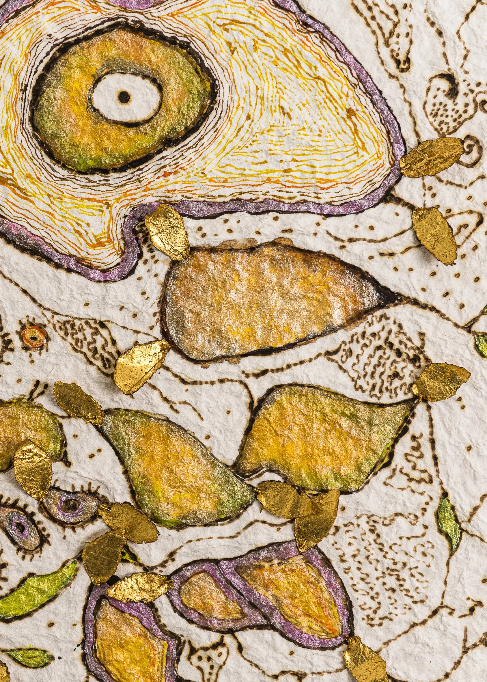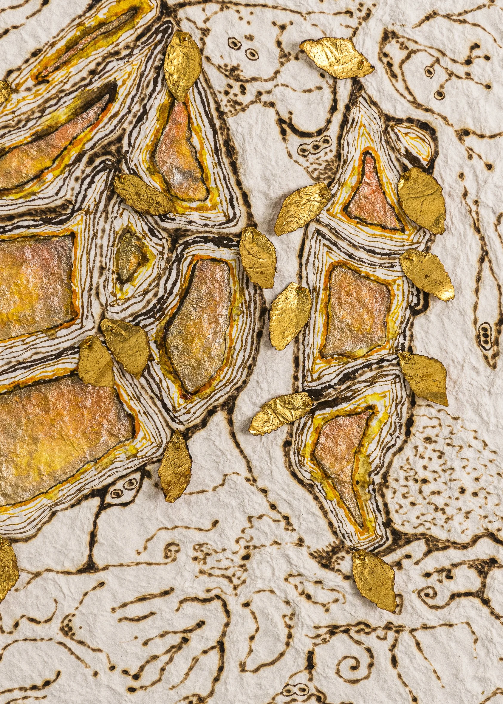 Moon Gold Bee is the latest in the Vitruvius Bee series by Bronwyn Berman. Made with various artisinal and hand made paper, using burning as a drawing tool, Moon Gold Bee also incorprates bees wax, pins and beads, white gold and yellow gold leaf. The sculptural work is madewith in the geometry of the bee.