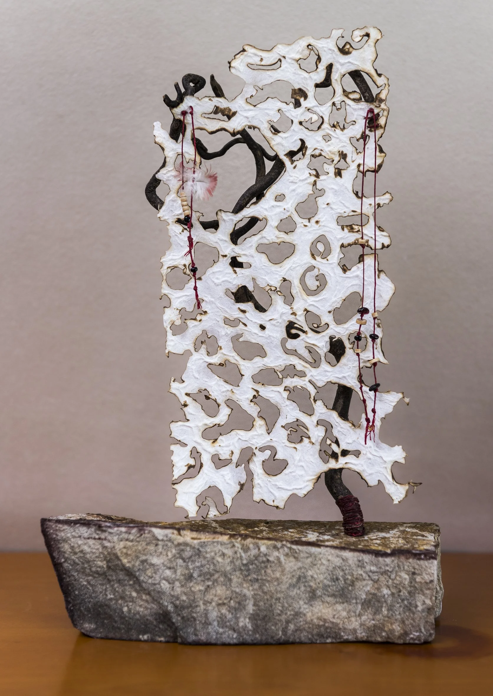 Stone, Japanese kuzo cloud paper with burning, casuarina root, waxed irish linen thread, beads, feathers